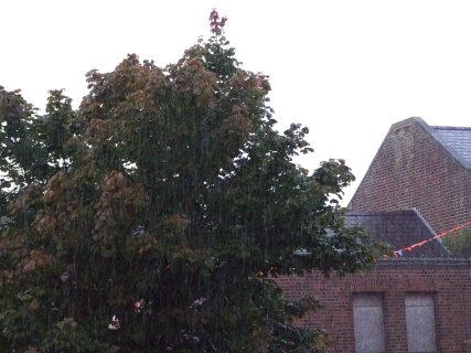 Wow ! It’s been a good few years since the Gala Square had a downfall like the one we saw tonight (well, OK, 2005, when the Ferry FM mast was hit by lightening comes close..) Following a Kick Boxing Display and with black clouds over the Square and the rain pouring down, the German Visitors bravely put on their play, re-enacting the fall of the Berlin Wall on 9th Nov 1989. Even with the awful weather the crowd happily played their part and the square was divided in two – re-unifiction took place just in time for the start of Pitchin’ The Sheaf, which this year saw a few changes in the results.